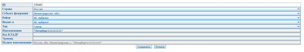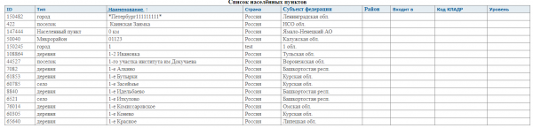 | ID | Тип | Наименование | Страна | Cубъект федерации | Район | Входит в | Код КЛАДР | Уровень |