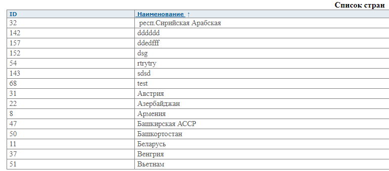 Данный интерфейс отображает список зарегистрированных в системе стран.