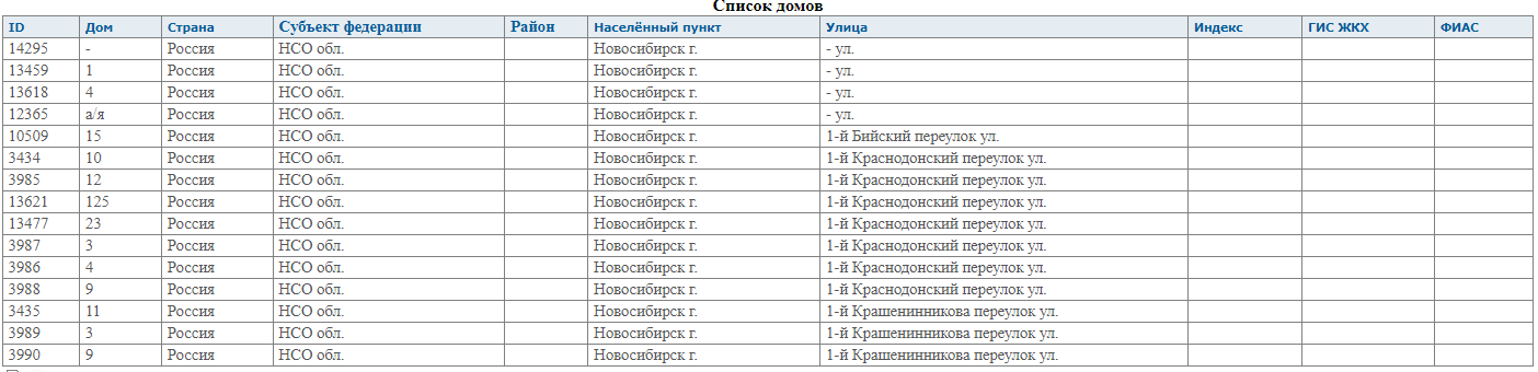 | ID | Дом | Страна | Cубъект федерации | Район | Населённый пункт | Улица | Код КЛАДР |