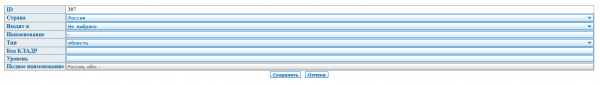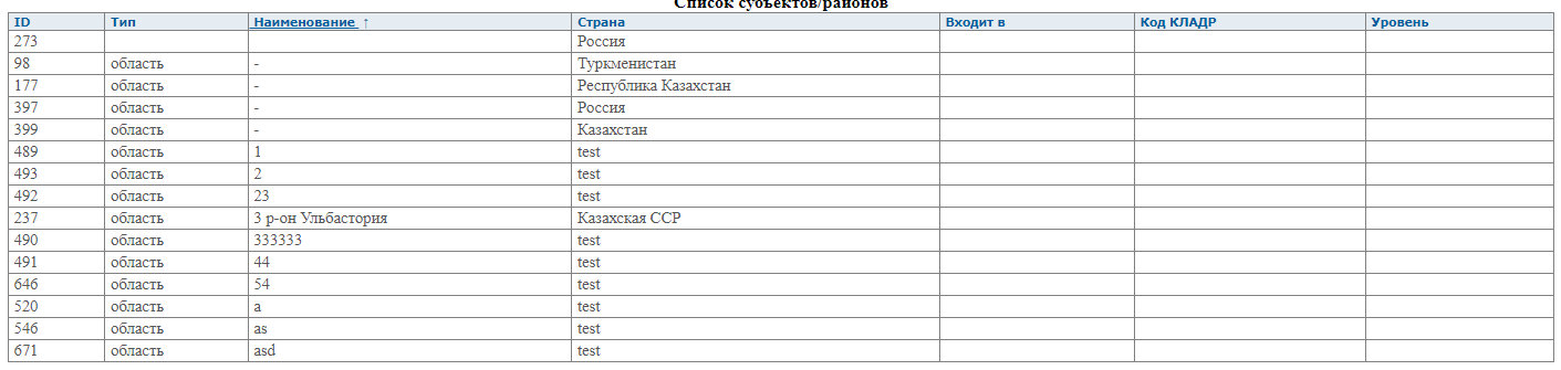 | ID | Тип | Наименование | Страна | Входит в | Код КЛАДР | Уровень |