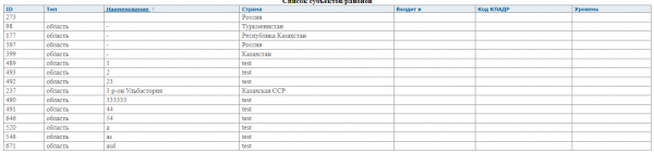 Данный интерфейс отображает список зарегистрированных в системе субъектов федерации (области, края), а также районов областей.
