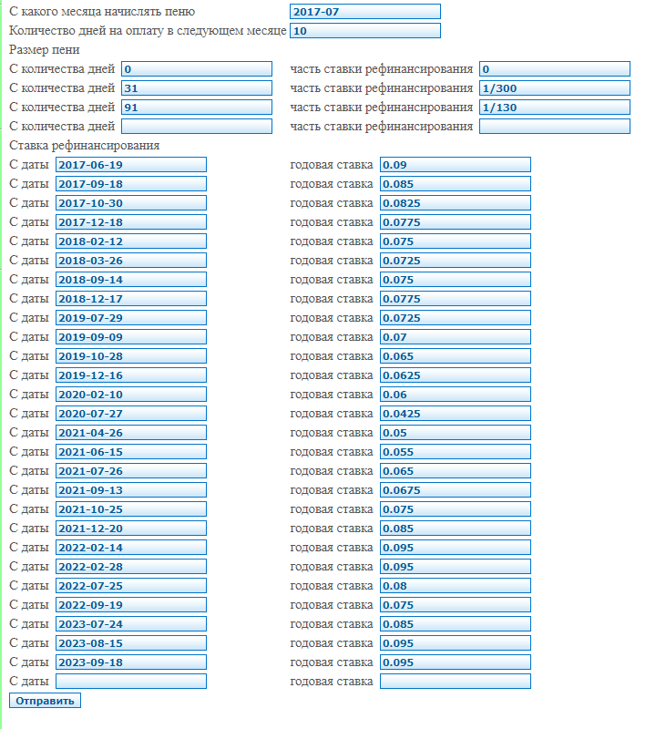 Данная страница позволяет менять параметры, в соответствии с которыми начисляются пени. Если меняется ставка рефинансирования, то её необходимо внести в нижней пустой строке в формате