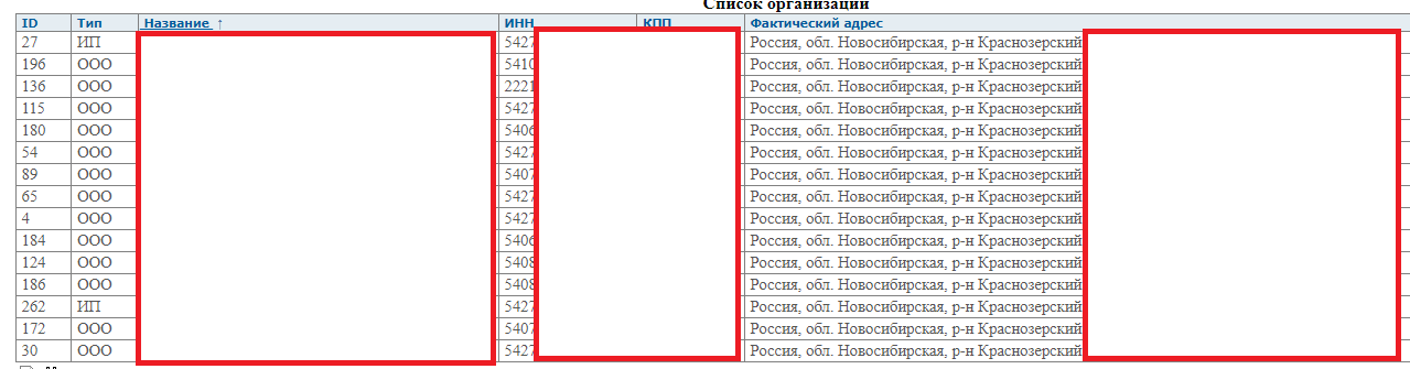 | ID | Тип | Название | ИНН | КПП | Фактический адрес |