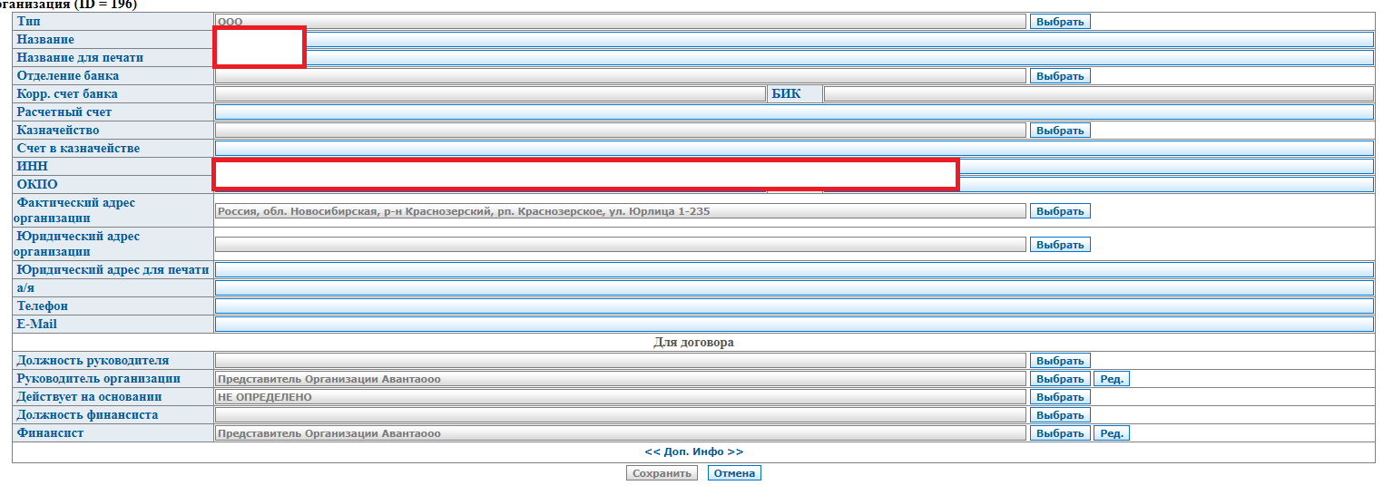 - Юридический адрес для печати: при указании данного значения оно указывается в бухгалтерских документах при печати, вместо юридического адреса.