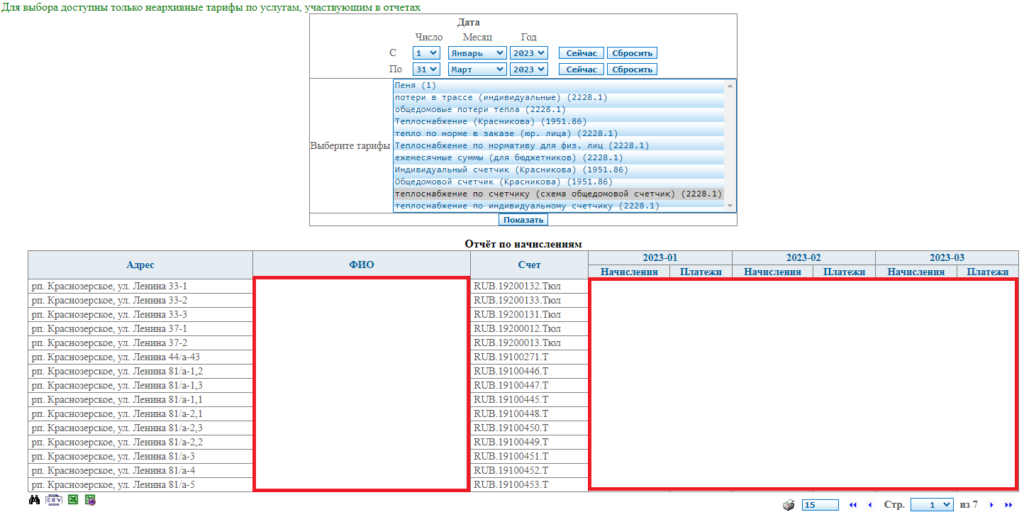 Интерфейс предоставляет информацию о начислениях и платежах в разрезе ЛС по выбранным тарифам.