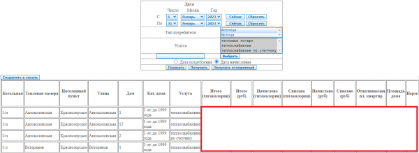 Отчёт по потреблению тепла в разрезе домов и услуг.
