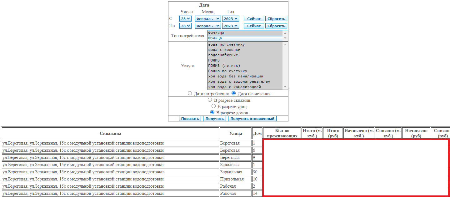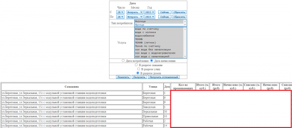 Отчёт по потреблению воды из скважин в разрезе по выбору