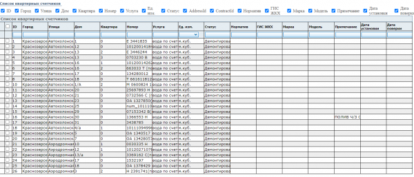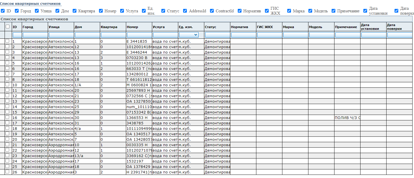 | ID | Город | Улица | Дом | Квартира | Номер | Услуга | Ед. изм. | Статус | Норматив | ГИС ЖКХ | Марка | Модель | Примечание | Дата установки | Дата поверки |