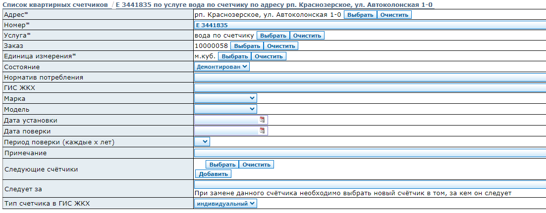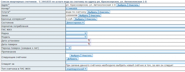 При клике на строку открывается интерфейс редактирования. Квартирный счетчик характеризуется: