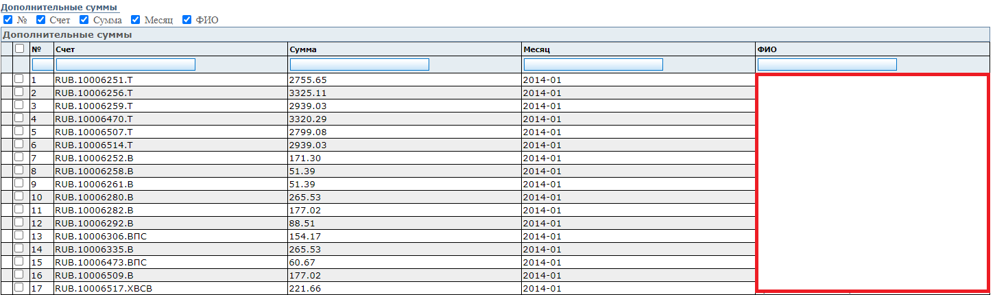 | Счет | Сумма | Месяц | ФИО |